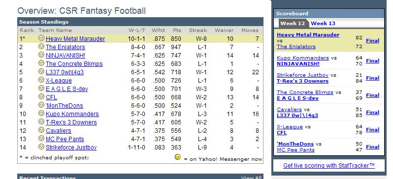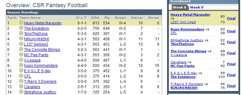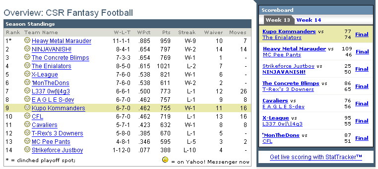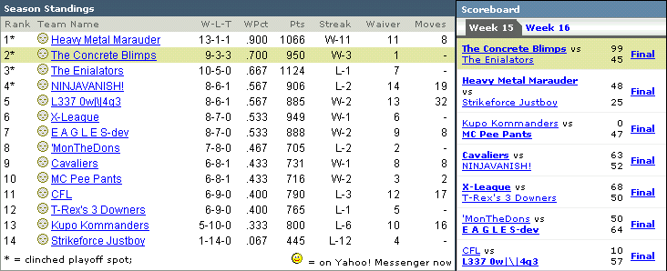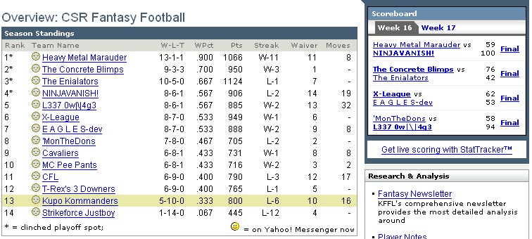 Argh i lost. How does the playoffs work what place do you have to be to get in. Can't wait till next years fantasy football league i will be a force to be reckoned with just wait. Hopefully i dont go last in the draft like this year.