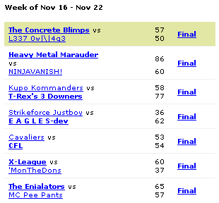 this just in.. NINJAVABISH beats the top seeded Heavy Metal Marauder... The Concrete Blimps defeats the Enialators!!!