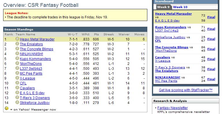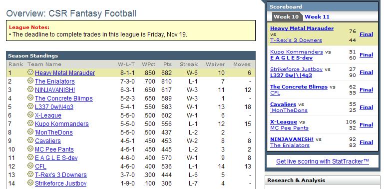 The main reason I lost, is the fact I didn't feel like checking it. I didn't realize my QB and one of my running backs weren't going to play until the game started and I never bothered to pick up a new one. If TO didn't get hurt, they probably would have still played the final games.