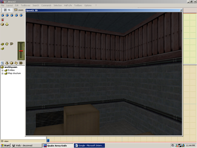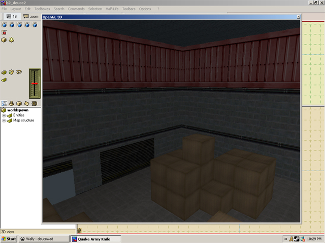 Ok just so that I'm not complaining about Deuce again, I thought I'd show a pic of his almost perfect blue metal wall (the one from the 'watery' set) in action in WC. The texture below it is the basic yellow brick I made - I'll make another version with an added border at the top and then I think it'll look even better. The red and green walls are still not right but at least we're getting somewhere!