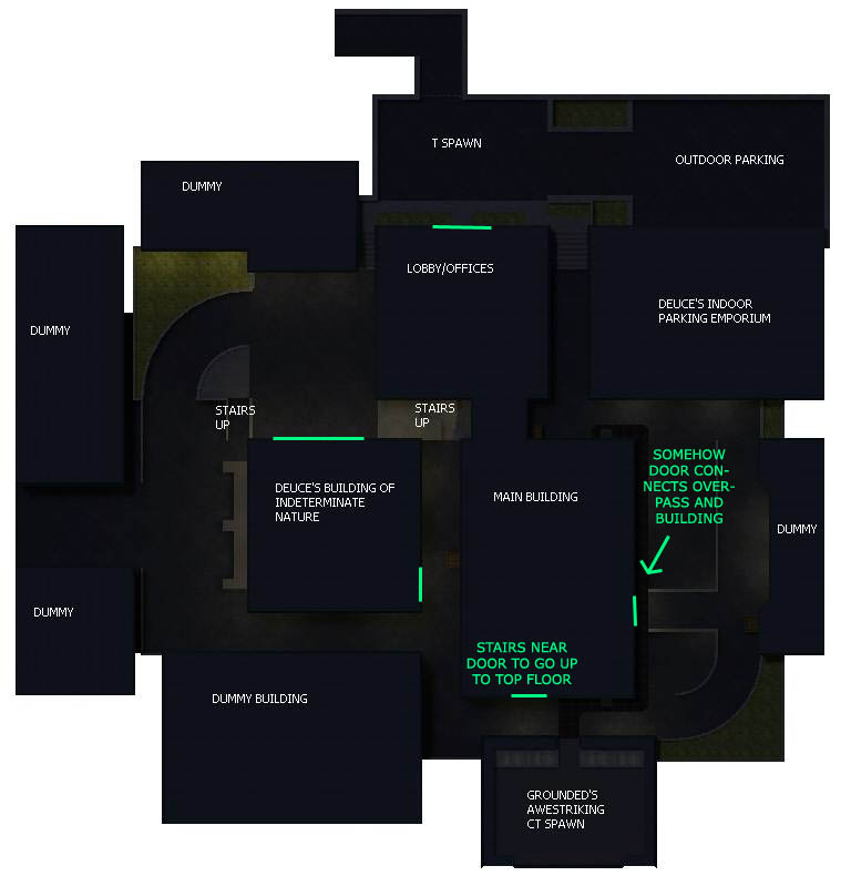 Go ahead. I had a sort of rough idea of what was required but it's pretty clear from the overhead view where the various doors need to be. Deuce and I were talking about having only 1 floor in the main building (the top floor) seeing as it would kind of be unnecessary to have 3 full floors now that we have longer, more well-defined exterior routes.