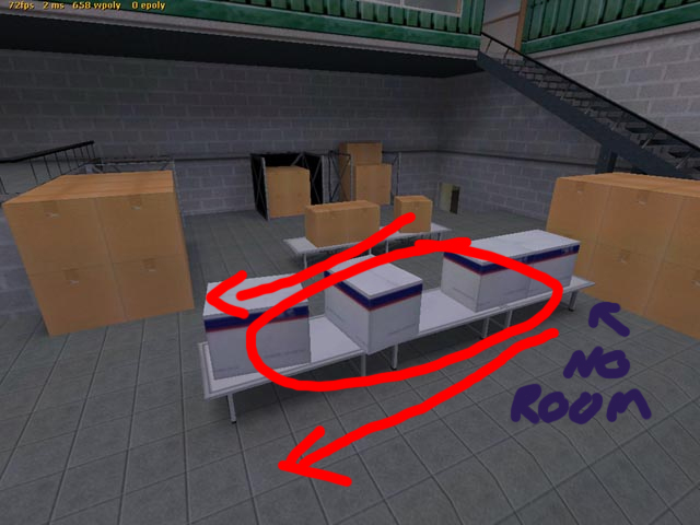 Some more things got done today. First, I went through all the textures we are currently using and found tons of unneccesary HL ones still in the map (i.e. on non-visible surfaces). They've all been replaced, which shaved a nice chunk off the bsp size Next I added lights for the lobby but then ingeniously forgot to modify the .rad file accordingly... Then I tweaked Deuce's cardboard box tex, added them to the wad and set about redoing the shipping room floor. The progress so far can be seen below, along with the new tex I made to go with it.